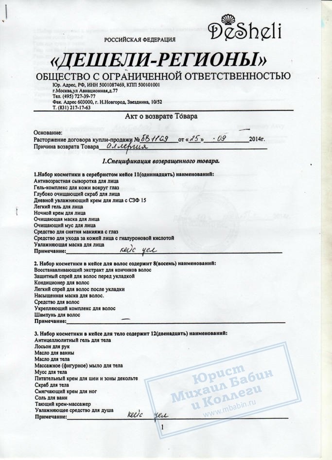 Гражданка Л. была приглашена на бесплатную презентацию косметики «Desheli», где ею в тот же день были приобретены в кредит 2 комплекта косметики. С учетом процентов долг клиентки составил 72.640 руб. К нам Л. обратилась с просьбой помочь расторгнуть кредитный договор и вернуть ненужную ей и неиспользуемую ею косметику.